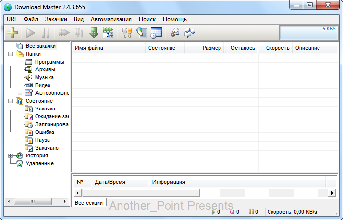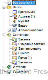 Здесь мы видим несколько категорий файлов. Все закачки сортируются по типу(который вы указали при создании закачки, либо он был определен автоматически), а также по состоянию. Также присутствует история закачек, и список удаленных.