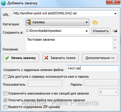 Слева на панели инструментов мы видим значок +. При клике на него, открывается окно создания закачки. Там мы вводим расположение файла, тип скачиваемого контента, описание, место сохранения. Под кнопкой "дополнительно" скрывается меню, где при необходимости вводятся данные для входа на сервер, количество секций закачки, включается отображение размера файла при добавлении закачки, и возможность просмотреть содержание архива перед скачиванием. Введем в поле "URL" адрес, где находится искомый файл, например http://another-point.w0.am/DOWNLOAD.rar