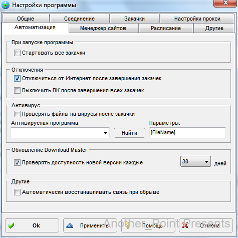 Сверху находится галочка "стартовать все закачки", в случае если она установлена запуск произойдет при открытии программы. Ниже галочки "отключиться от интернета после окончания всех закачек" и "выключить ПК после окончания всех закачек". Программа также позволяет проверить скачиваемые файлы антивирусов, если таковой установлен. Есть автообновление, а также возможность автоматически восстановить соединение с сетью в случае его обрыва(используются параметры последнего соединения).